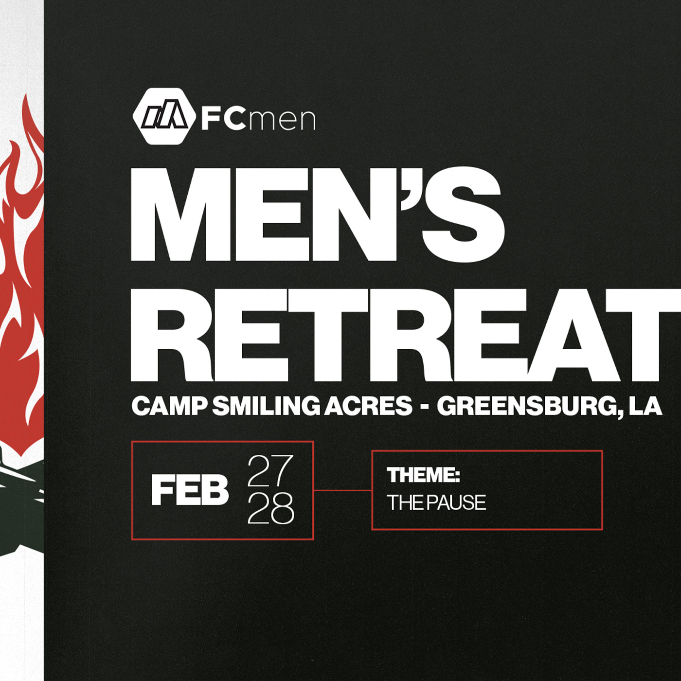 Men of FC- hit the pause button for a weekend and join us for a weekend to retreat and reset. We will worship, eat, rest & have a little fun! This year’s retreat will be held on Feb 27-28 at Camp Smiling Acres in Greensburg LA.